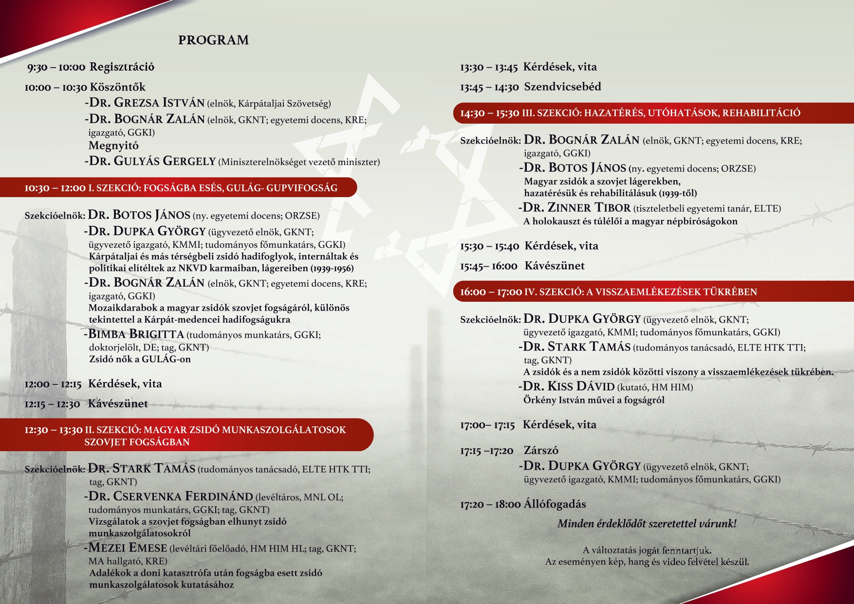 A konferencia célja bemutatni és tudományos keretek között elemezni a második világháború egyik alig feltárt fejezetét – azoknak a holokauszt-túlélőknek a sorsát, akik a szovjet lágerek fogságába kerültek.